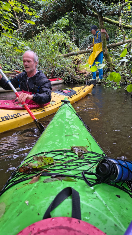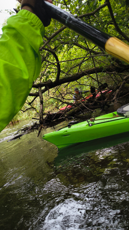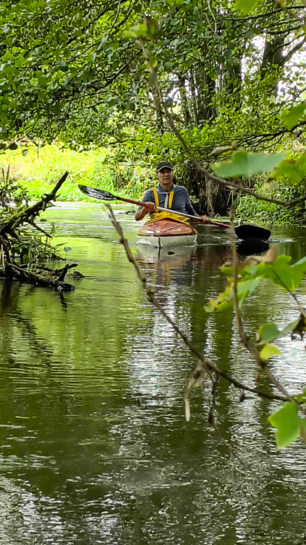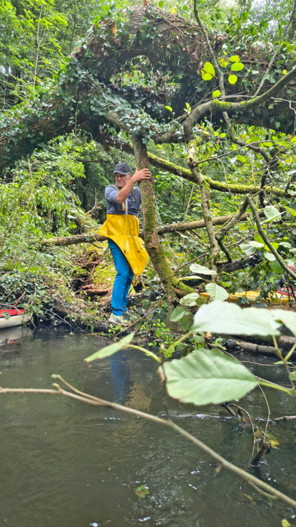 Deshalb haben wir uns im September entschiede die Tour nachzuholen. Die Wettervorhersage war ziemlich gut, die Temperaturen sollten bis 22° steigen und die Regenwahrscheinlichkeit gering. Also ein schöner Tag zum paddeln. Eingesetzt wurde nach dem Wildpark Eckhold an der Strassenbrücke Weiden/Bass und frohen Mutes ging es los. Aber schon noch wenigen Metern wurden wir von umgefallenen Bäumen und im wasserhängendem Gestrüpp gestoppt! Mühsam quälten wir uns unter den Bäumen durch, zum Teil mussten wir ganz in die Boote.rutschen um durchzukommen. Zum Glück war der der Wasserstand niedrig, sonst hätte es nicht geklappt. Wir haben aber alle Hindernisse besiegt und mussten nicht aus den Booten raus! Nur Sven ist aus dem Boot raus, um zu helfen.